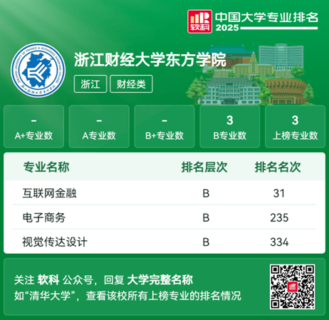 本院视觉传达设计专业再次上榜B类专业,上榜专业数占全校专业比9.09%。这也是自2022年起,东方学院唯一连续4年上榜软科排名的专业,在“2025软科中国大学专业排名”中位列第334名,全省排名23名,位列全国高校同专业前42.39%。