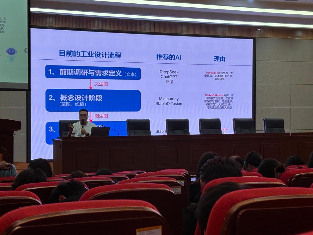 2025年10月23日,杭州腾赢工业设计有限公司总经理沈达先生应工业设计系王芳老师邀请,为我院设计专业师生带来了主题为“AI时代的设计师品牌”的精彩讲座。他结合自身十余年的设计服务与近年的产品开发运营经验,深入探讨了人工智能技术为产品设计开发领域带来的深刻变革。