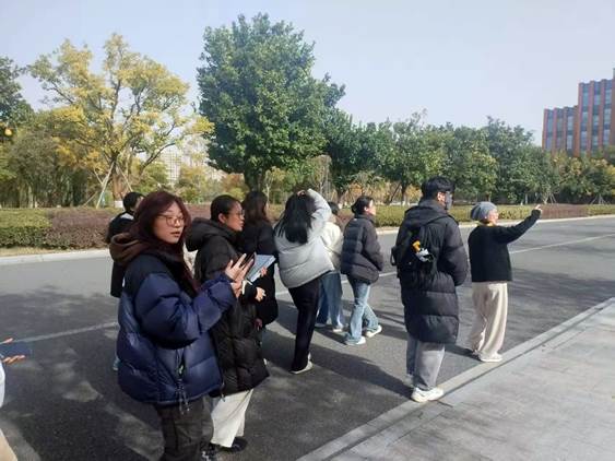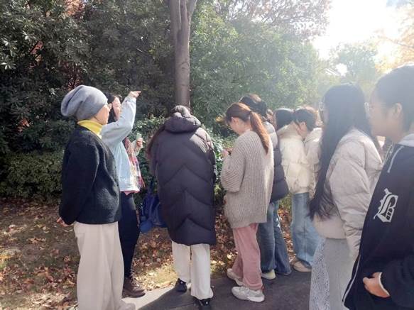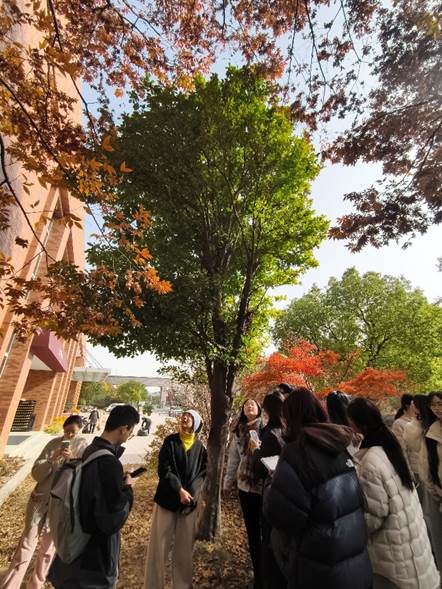 理论讲座结束后,一场别开生面的校园实地教学随即展开。吴善佳与孙婧老师共同带领同学们漫步校园,以教学楼、图书馆、学术食堂以及景行湖周边的植物为“活教材”,逐一讲解各类植物的生长习性、枝干姿态与叶片特征,细致拆解其中蕴含的植物设计手法。同学们在现场近距离观察,亲手触摸叶片与枝干的质感,将课堂理论与实物认知深度结合,对植物设计的理解愈发立体鲜活。