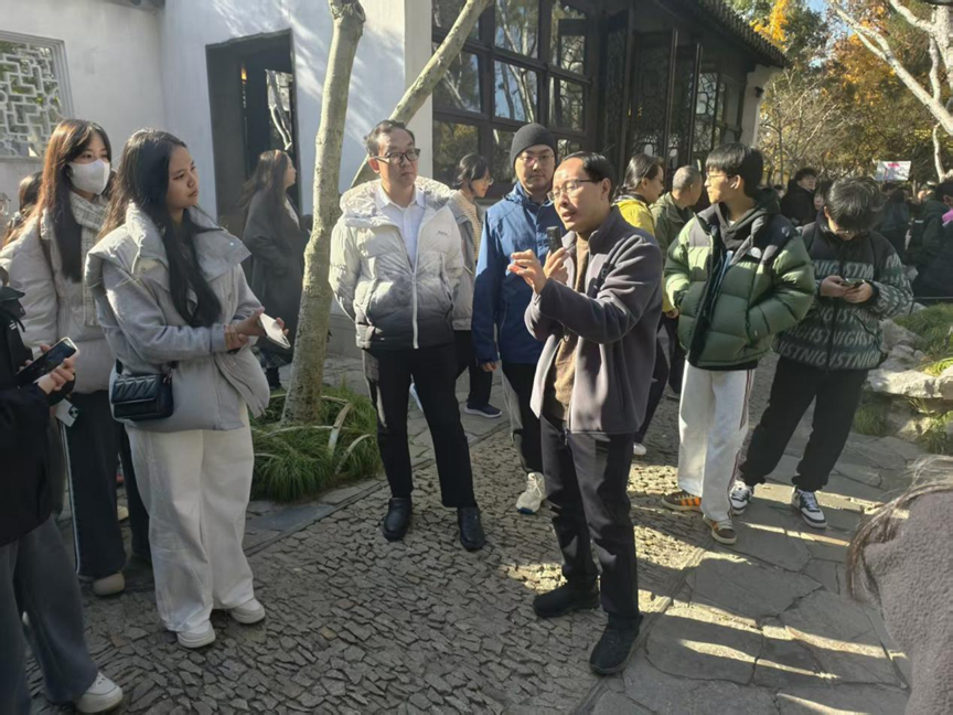12月9日上午,文设学院环境设计专业25级学生在苏州拙政园开展现场教学。拙政园管理处副主任程洪福为学生现场授课。讲座深度融合历史考据、设计哲学与遗产保护管理,旨在引领学生突破思维定式,从专业角度重新审视文化遗产的核心价值。《设计考察》课程教师、学院领导参加现场教学。