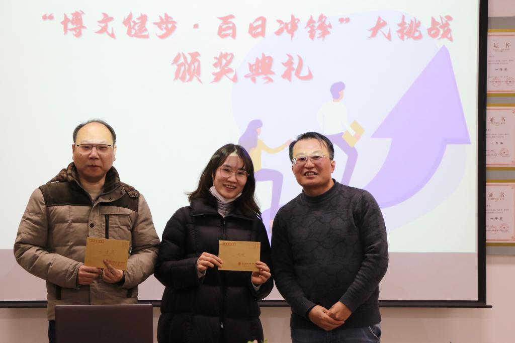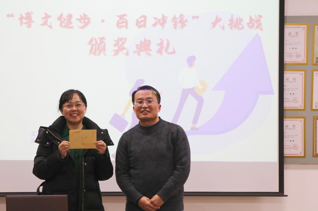 “博文健步·百日冲锋”步数大挑战颁奖仪式1月6日下午在文设学院会议室举行。党总支书记陈明亮、文设学院分工会主席李香珠联袂为获奖团队颁奖,全体教师共同见证这场历时百日的“云端健步”圆满收官。