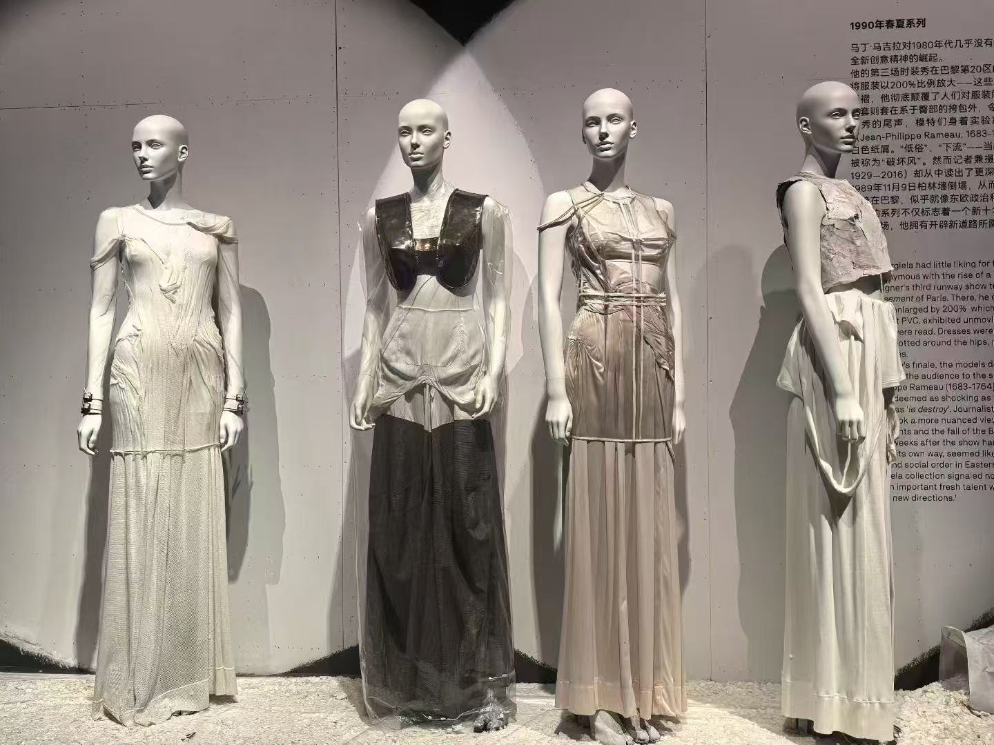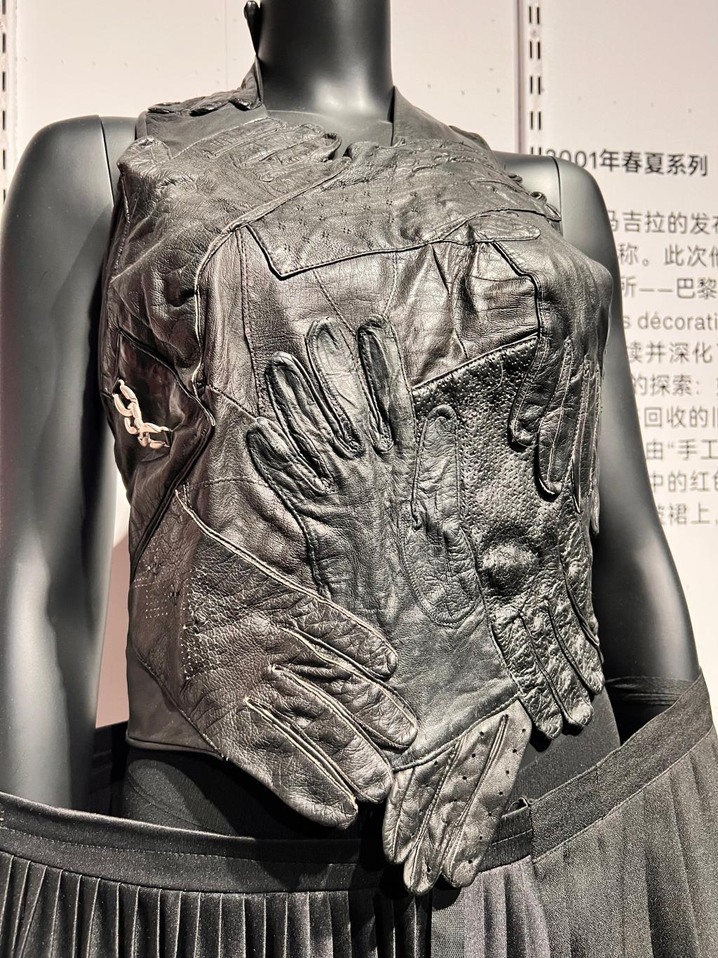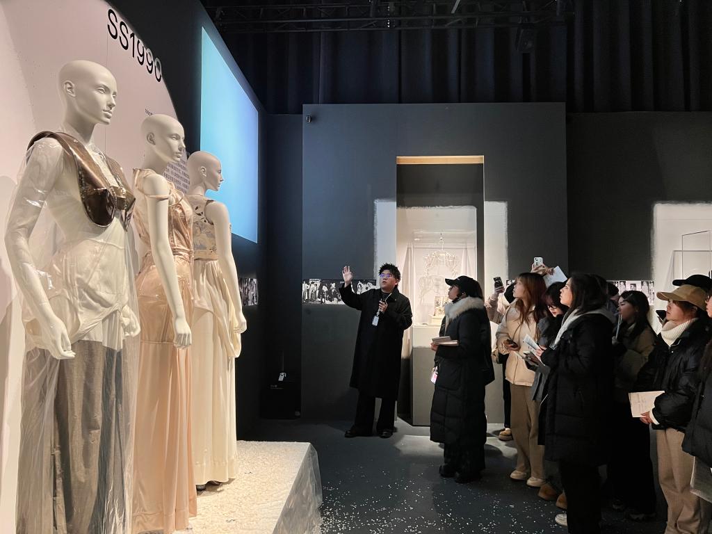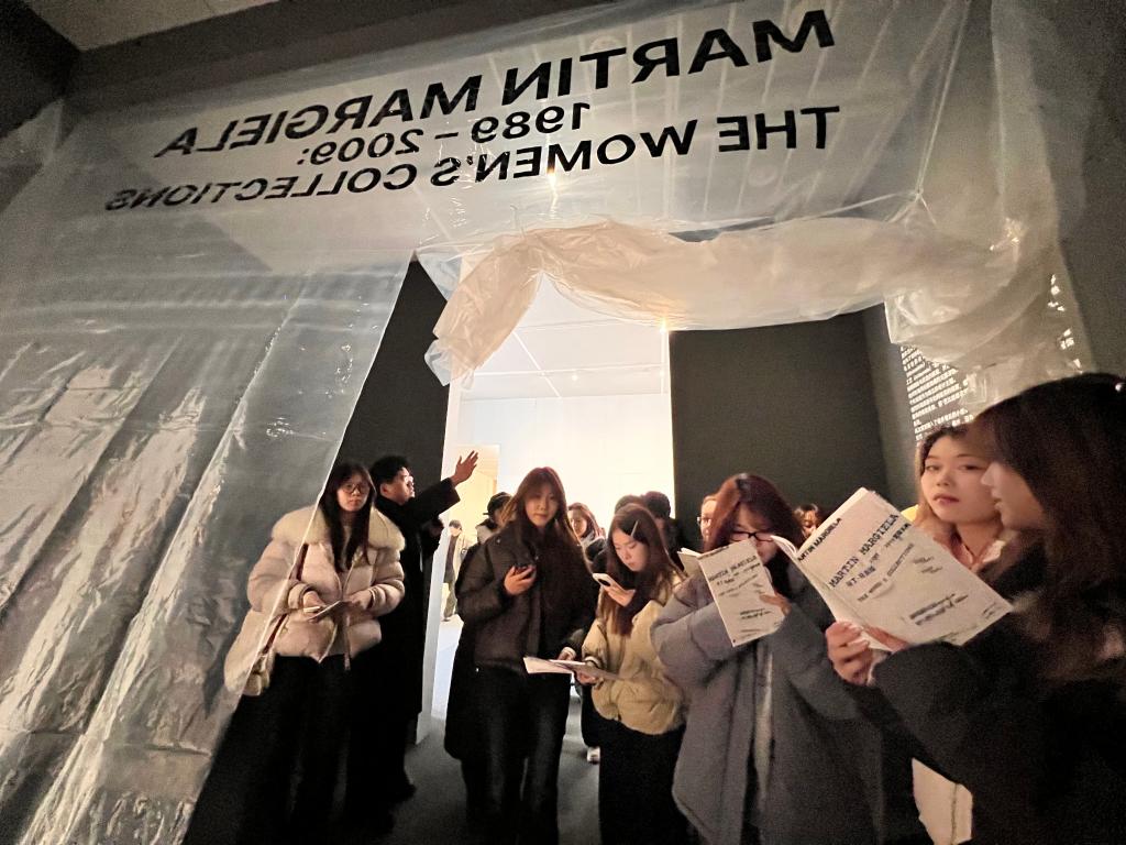 午后,师生团队转场天目里,走进马吉拉(Maison Margiela)服装展。如果说丝绸博物馆的天然染料双年展是对传统手工艺“根脉”的深耕,那么这场展览则是对当代手工设计语言“边界”的突破。作为解构主义设计的代表,马吉拉将“手工艺”从单纯的技术层面提升至观念表达层面.展厅内,大量运用手工做旧、撕裂、拼接等技法的服装作品,彻底打破了学生们对传统手工艺的固有认知。展览呈现的马吉拉式当代先锋美学,通过手工打磨牛仔面料边缘、刻意保留手工缝线痕迹以及异质材料重组等方式,充分展现了手工艺在塑造服装廓形与叙事性上的无限可能。在高级定制系列展示区,传统手工钉珠与刺绣技法被赋予极简与抽象的表达形式,不再是繁复的装饰元素,而是成为构建服装艺术张力的核心力量。这种将基础手工技法与先锋设计思维深度融合的实践案例,为教学团队带来重要启示:手工艺课程不应止步于技法复刻,更要引导学生探索手工痕迹在现代设计中的情感价值与观念传递,让传统手工艺在当代设计中焕发新活力。