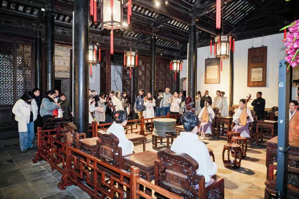 当晚,在新书作者、同济大学周向频副教授的引领下,受邀嘉宾、市民以及留学生们,一同夜游网师园,沉浸式感受明月夜幕下的园林雅韵。夜色中,丝竹琴箫之声悠扬婉转,众人沉醉于“月到风来”的诗意景致,在辞旧迎新的氛围中,深切体悟江南园林的文化魅力与时代生命力。