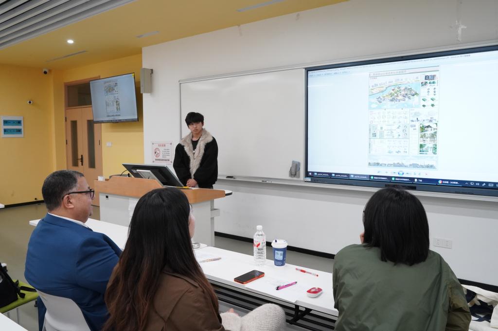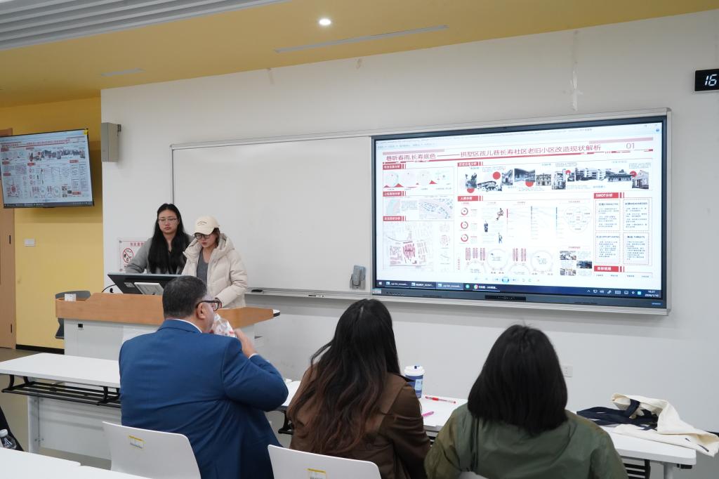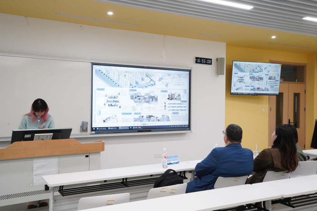 评审嘉团阵容囊括了课程教师沈奕岚老师、Rabee Reffat教授和西湖边的原住民章老师,他们从“空间需求洞察”“可持续技术应用”“设计可行性”等维度深入点评了每一组汇作品,并提出建议,让同学们在思维碰撞中明晰改进方向。