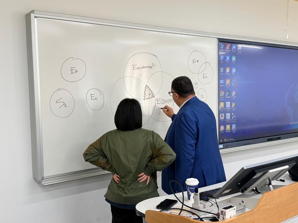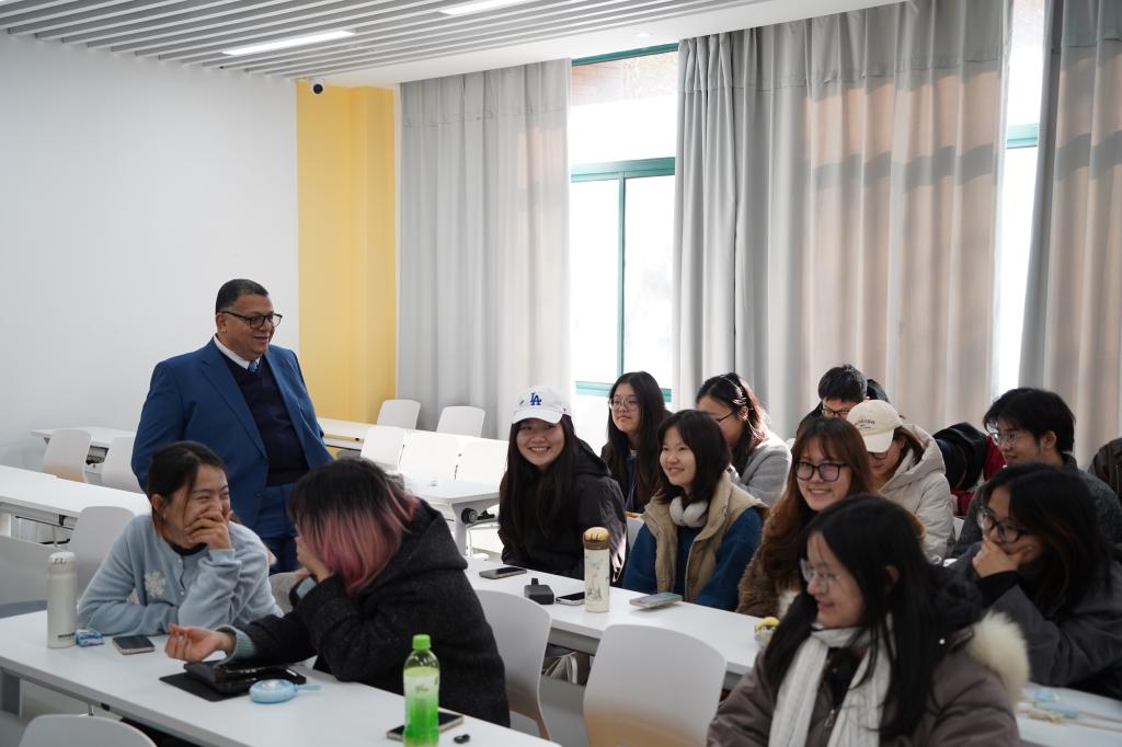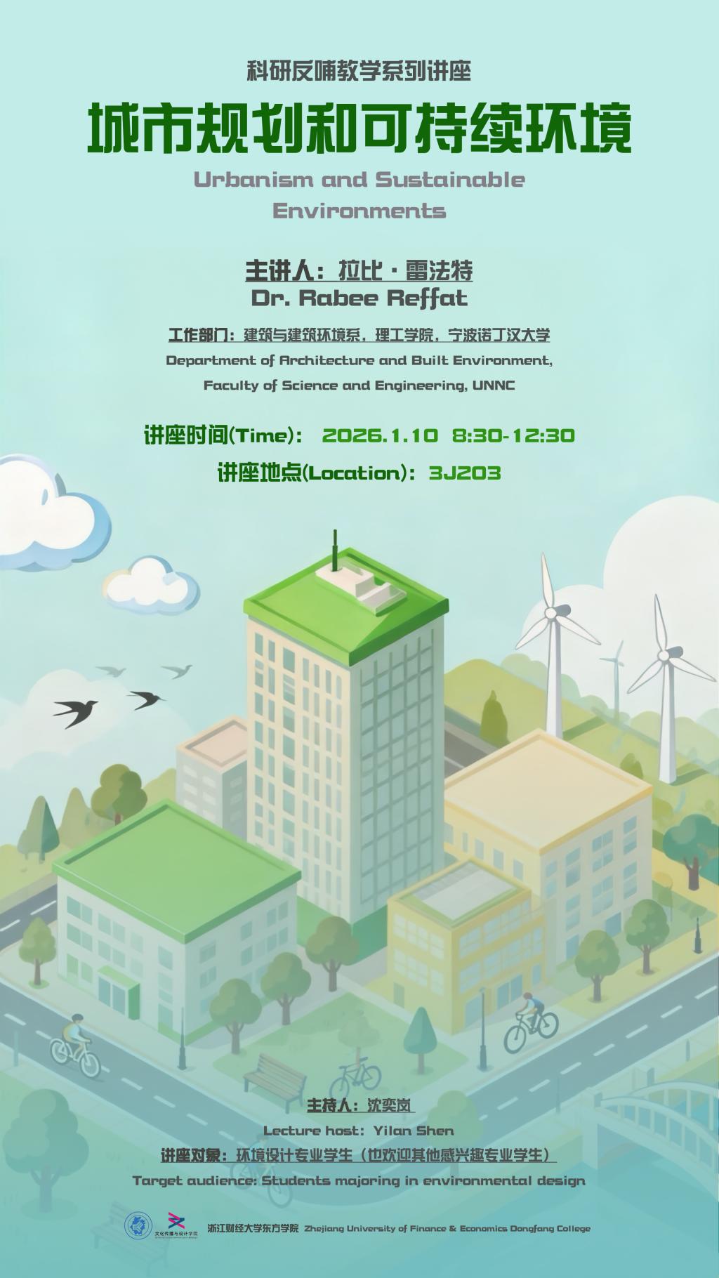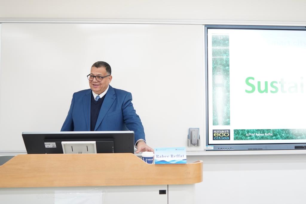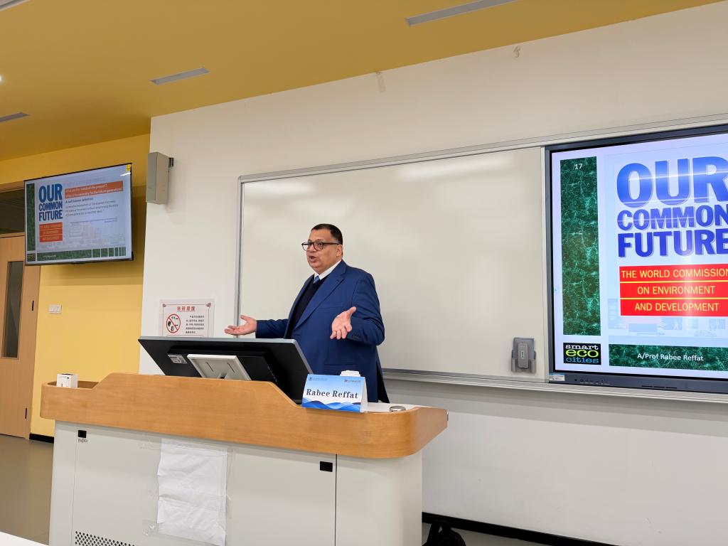 10日上午,沈奕岚老师特邀宁波诺丁汉大学理工学院建筑与建筑环境系Rabee Reffat教授,带来“城市规划和可持续环境”主题讲座。Rabee Reffat教授深耕于设计计算与人工智能、绿色可持续建筑、智能城市等领域,兼具教学、研究与产业合作经验,他从前沿的科研视角出发拆解了城市可持续环境设计的核心逻辑,从阐述能源效率优化到解释数字技术赋能更新,为在场师生带来了深刻启发。