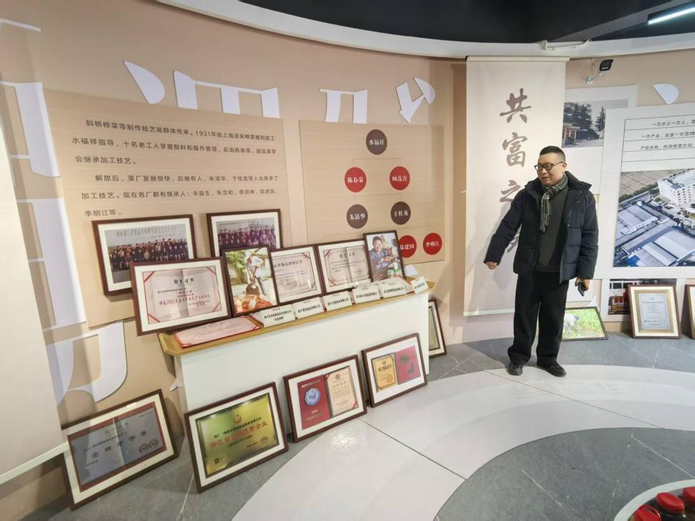 离开生产车间,我们来到斜桥榨菜博物馆,在仲乐村党委委员、村委会副主任王晓国的讲解下,翻开斜桥榨菜近百年的产业史。这里有民国时期的腌制陶坛,有早年销往上海的包装标签,有记录着工艺流程的手写账本,更有展示斜桥榨菜各种国字号和省字号的荣誉证书。从最初的坛装外销,到如今远销日本、美国、加拿大等国家和地区,从家庭小作坊到标准化企业,从单一品种到多元化产品。王晓国主任特别强调,斜桥榨菜制作技艺很早就已成为嘉兴市级非物质文化遗产,这份荣誉不仅是认可,更是责任,让更多人了解榨菜背后的文化,便是对非遗最好的传承。