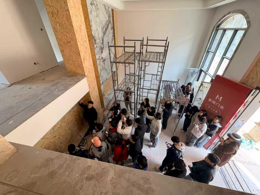 调研的第二部分为桐乡市洲泉镇石山头村万盛佳苑别墅住宅项目工地参观。在现场教学环节中,项目设计师刘女士与项目经理冯先生为师生进行了讲解。从项目整体设计理念出发,结合施工现场实际情况,对空间中的材料应用与施工工艺进行了系统介绍。参观按照施工现场的空间流线展开,同学们依次了解了客厅背景墙、吊顶系统、护墙板构造、电梯空间、厨房柜体等关键部位的施工做法,并重点学习了施工节点的处理方式及其与设计效果之间的关系,使学生能够更加直观地理解设计图纸在施工阶段的实现过程。