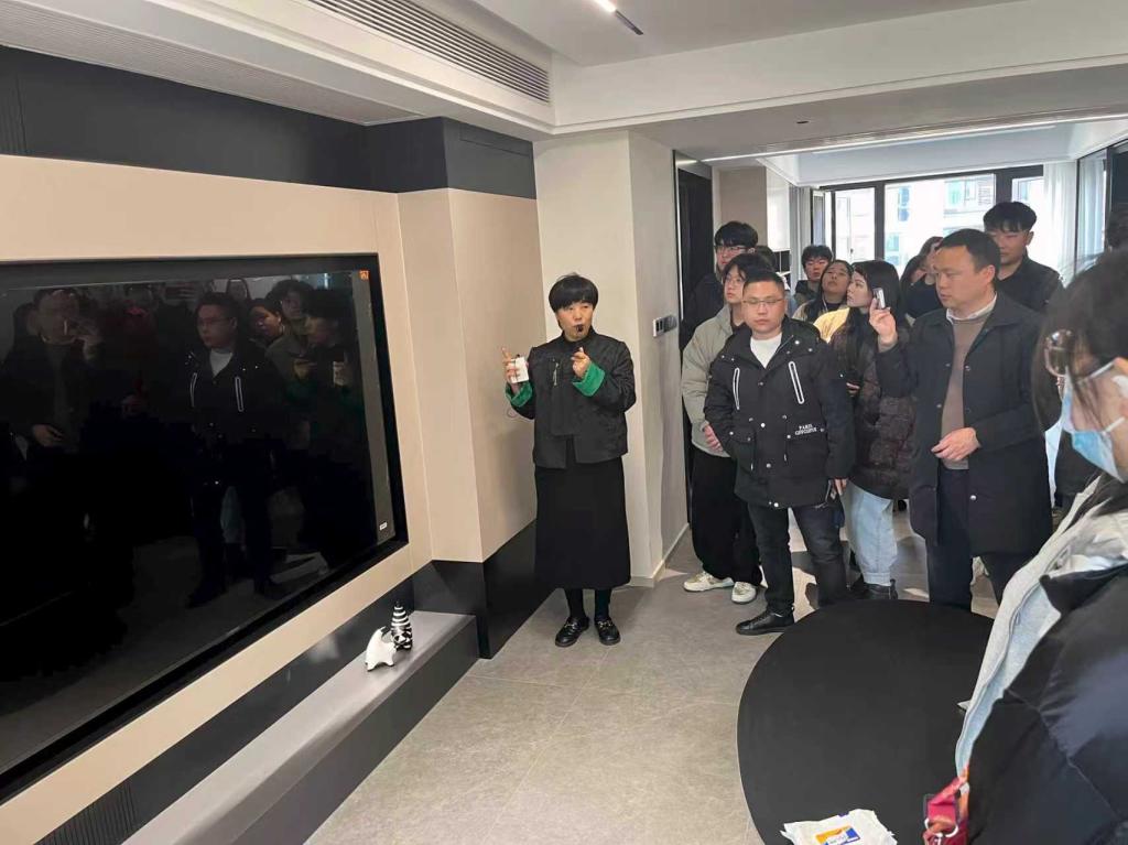 本次调研的第一部分在清风室内设计培训学校举行。学校校长单求安以《深化落地管控》为主题,为同学们带来了一场专业讲座。讲座围绕设计方案从概念到落地的全过程展开,重点探讨了材料选择、施工工艺节点以及不同工艺之间的衔接逻辑。单校长结合实际工程的反面案例,解析了设计深化在室内设计项目中的关键作用,并介绍了深化设计对设计师专业能力与职业素养的要求。通过讲座,同学们进一步认识到材料与工艺不仅是设计表达的重要媒介,也是设计落地与品质控制的重要基础。