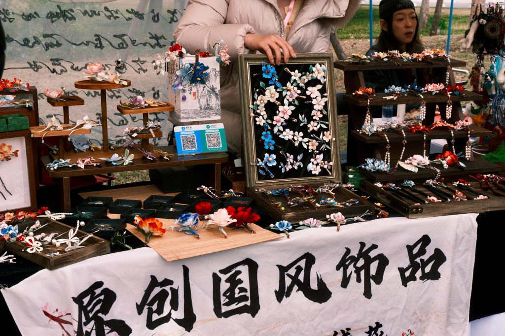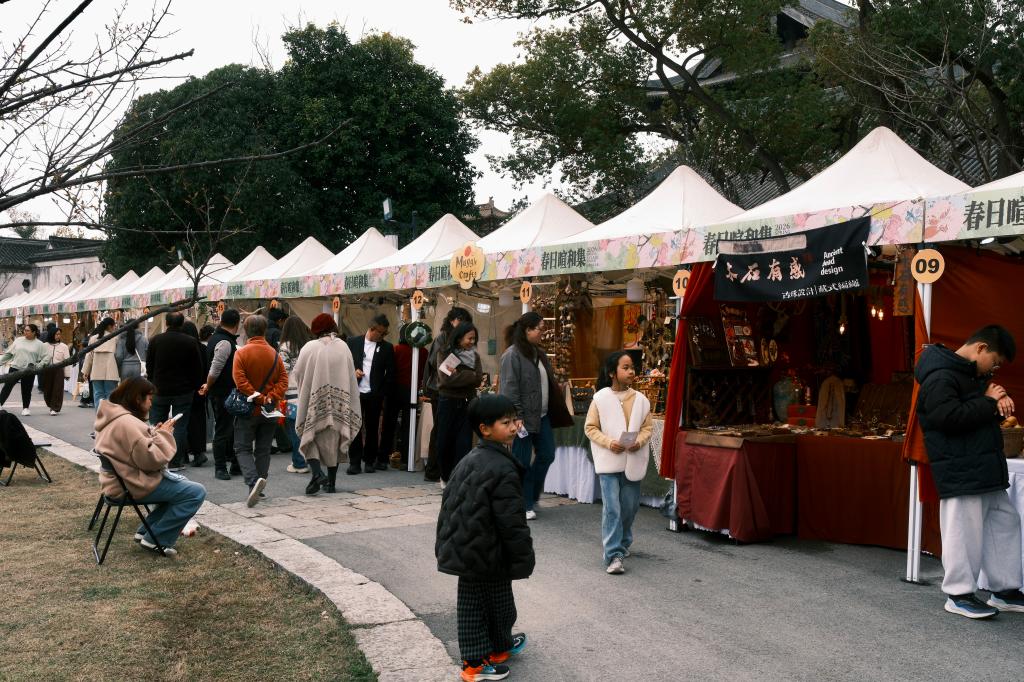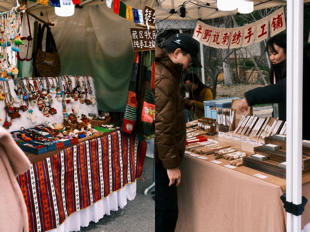 古镇市集热闹纷呈,白帐绵延,手作好物琳琅满目。国风缠花、手工编织、刺绣香品次第陈列,市井烟火与匠人巧思相融,同学们驻足挑选、细细欣赏,感受传统手艺的鲜活温度。