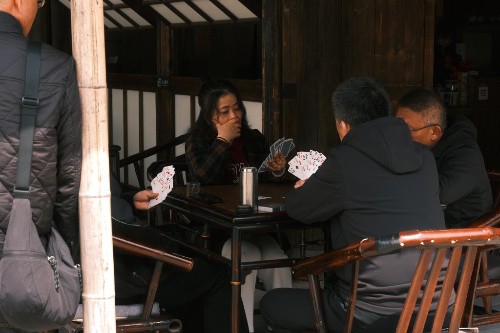 木门框住一汪碧水,有人静坐岸边,让春风与流水漫过时光;木桌旁,牌局正酣,市井的烟火气在谈笑间缓缓流淌;乌篷船摇过青绿水巷,桨声与檐角的风,把江南的温柔揉进每一寸光影里。