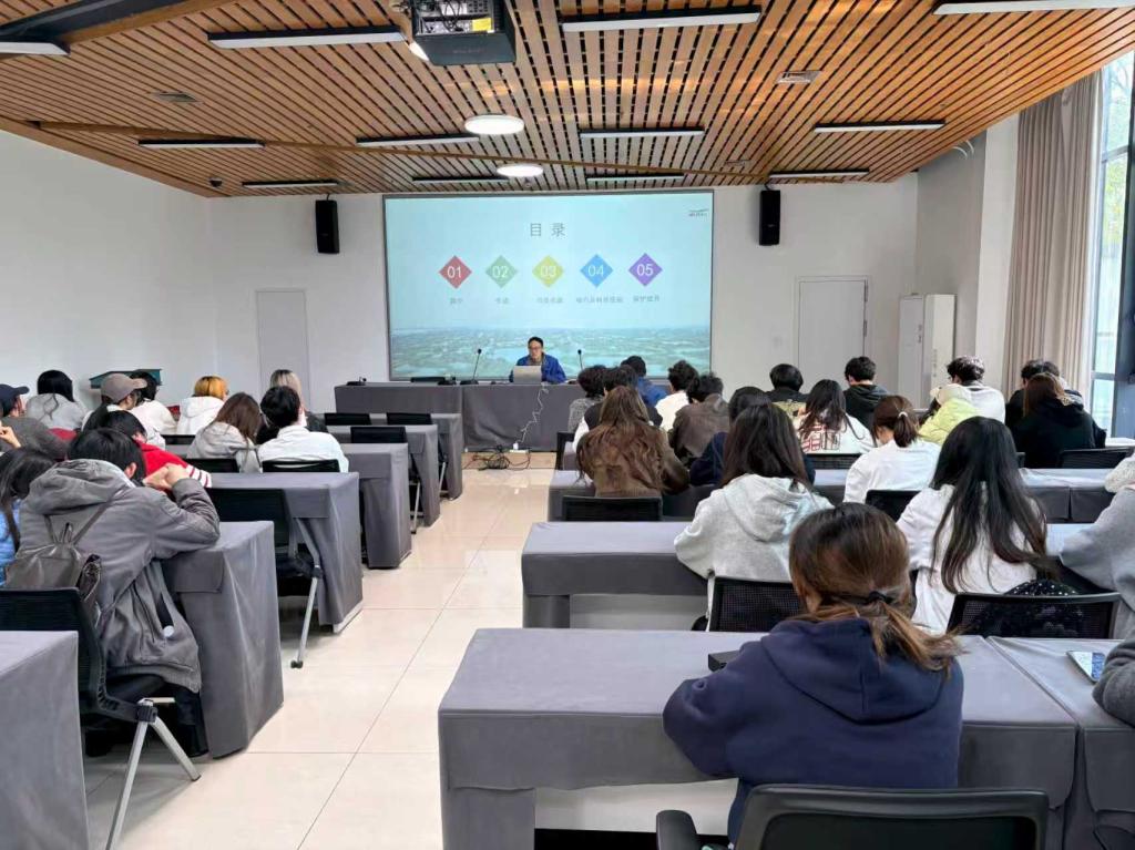 本次调研围绕课程建筑设计作业“湿地观鸟屋设计”任务展开,引导学生从真实场地出发,理解建筑设计与自然生态保护之间的协同关系。调研伊始,师生一行听取了题为“西溪湿地莲花滩观鸟及保护提升”的专题讲座。讲座聚焦杭州西溪国家湿地公园,特别是莲花滩观鸟区的鸟类保护与观鸟实践,从湿地的生态区位优势、鸟类资源现状、栖息地保护工程实施情况,到观鸟的最佳时间与基本方法,进行了系统而生动地介绍。