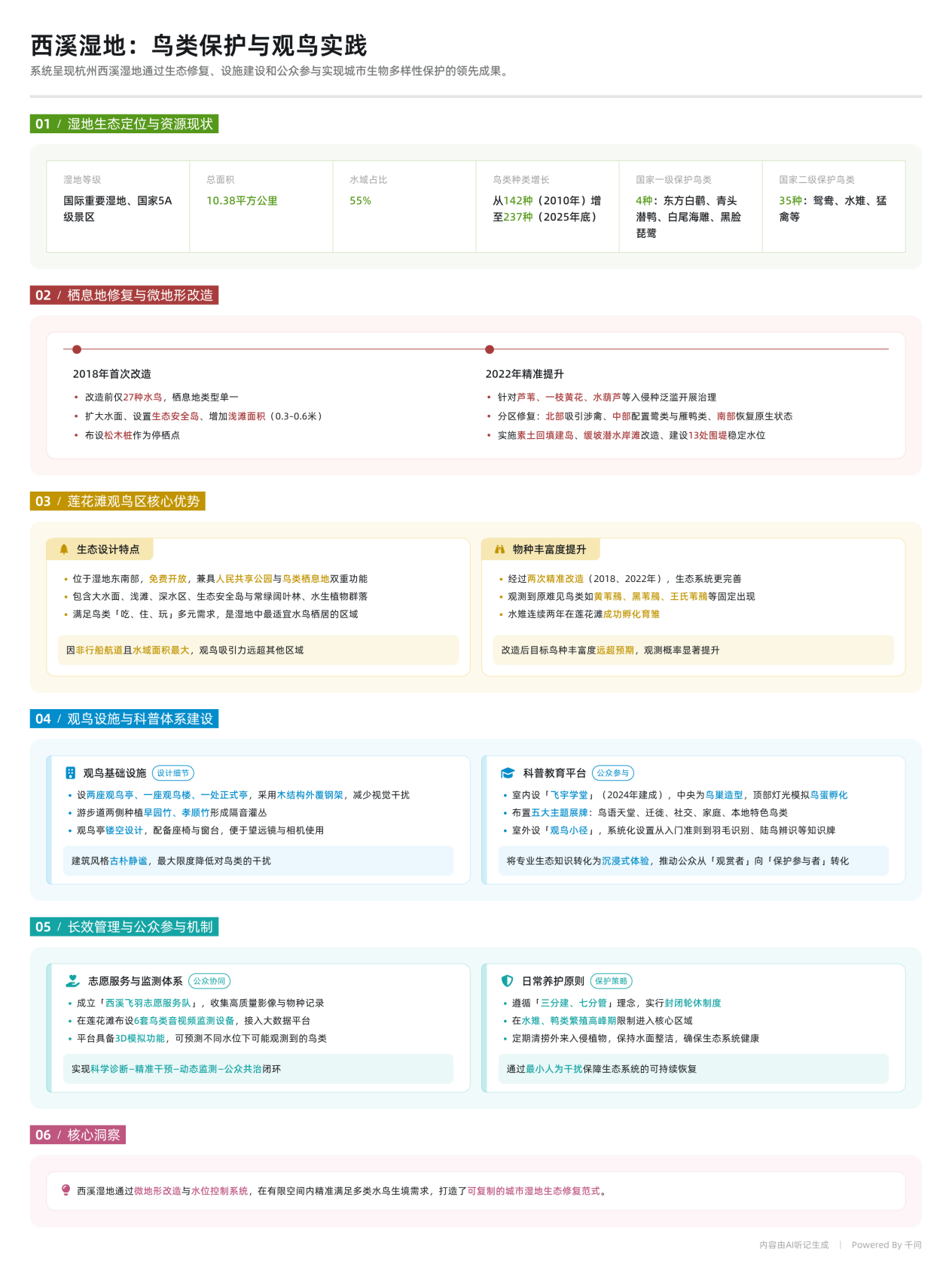 讲座中,主讲人重点讲述了莲花滩观鸟区自2018年、2022年两次实施精准栖息地提升改造以来,在鸟类栖居环境改善、水鸟种类与数量增加等方面取得的显著成效。与此同时,区域内逐步完善了观鸟亭、观鸟屋、科普展示等相关设施,形成了集生态保护、自然教育与公众参与于一体的观鸟空间体系。讲座还特别强调了公众参与、科学监测与持续养护在湿地生态保护中的重要意义,并鼓励观鸟初学者参与导赏活动逐步建立科学观鸟意识,提升生态保护素养。