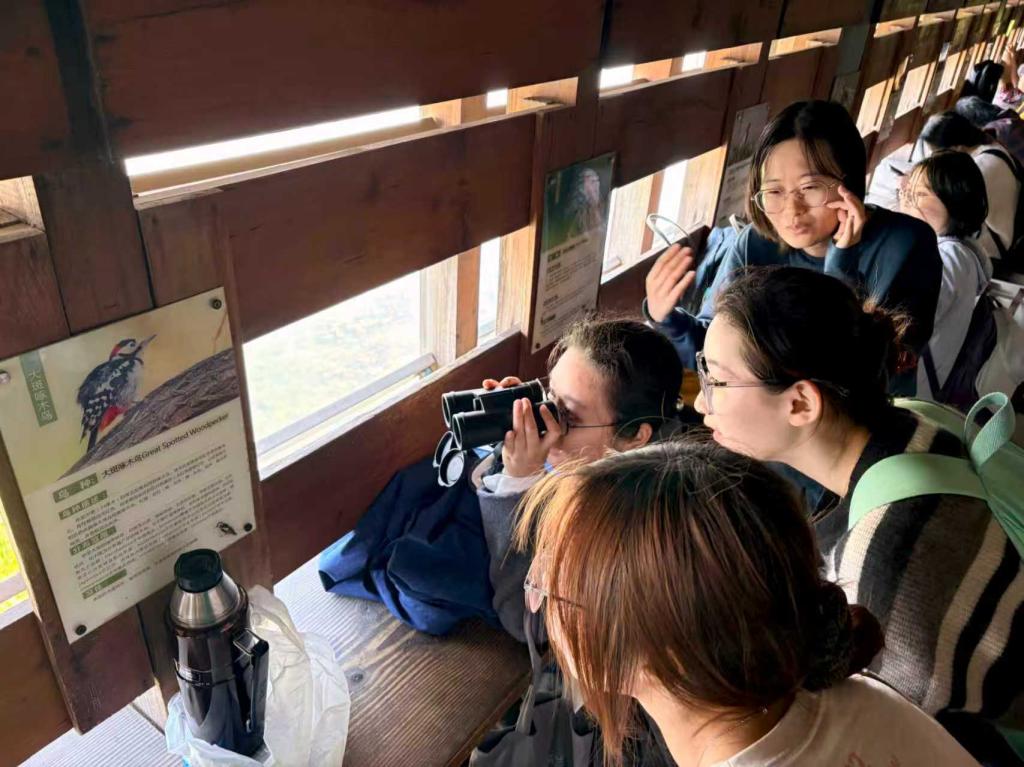 讲座结束后,全体师生前往莲花滩观鸟区域开展实地调研。大家沿着湿地步道深入场地,对湿地生态环境、观鸟亭、观鸟屋等设施进行了细致考察,并结合现场视野条件、空间布局、建筑形式、材料特征及人与鸟类活动之间的关系展开观察与记录。同学们还在现场进行了观鸟体验,通过亲身感受进一步理解观鸟设施在“隐蔽观察、适度停留、环境融合、生态干预控制”等方面的设计要求。